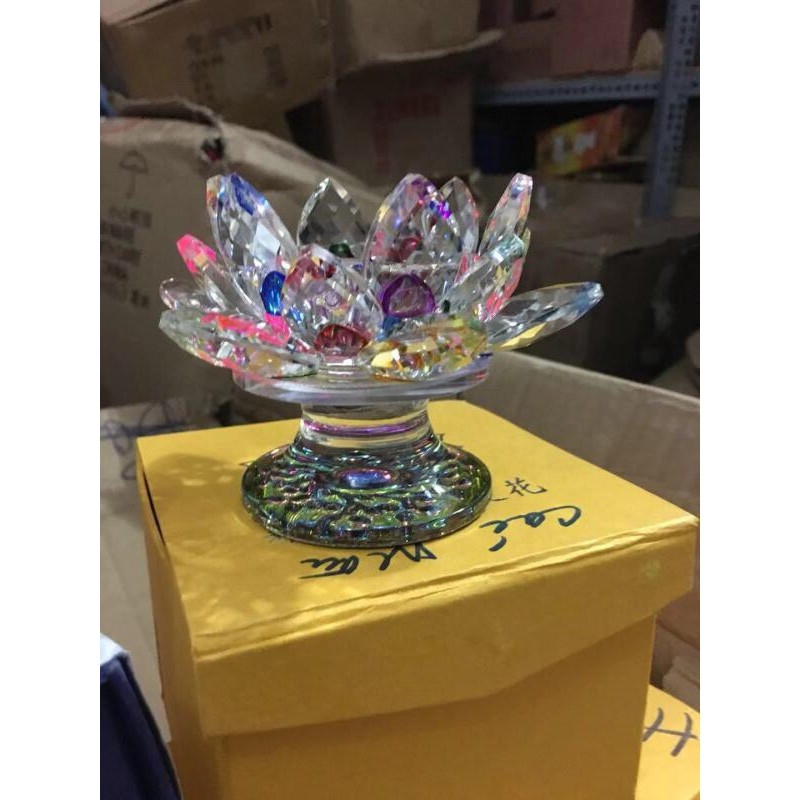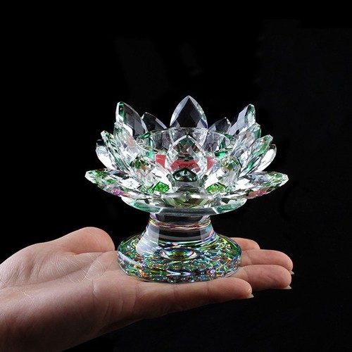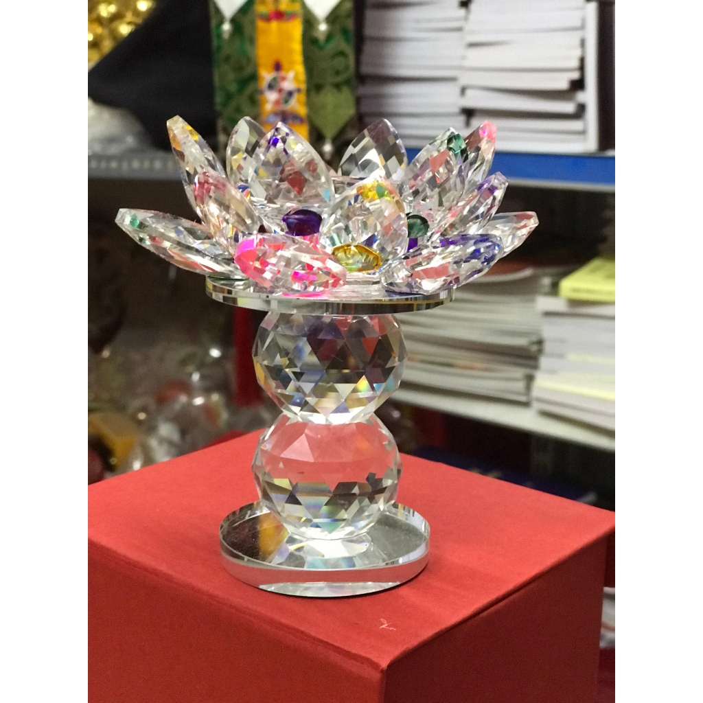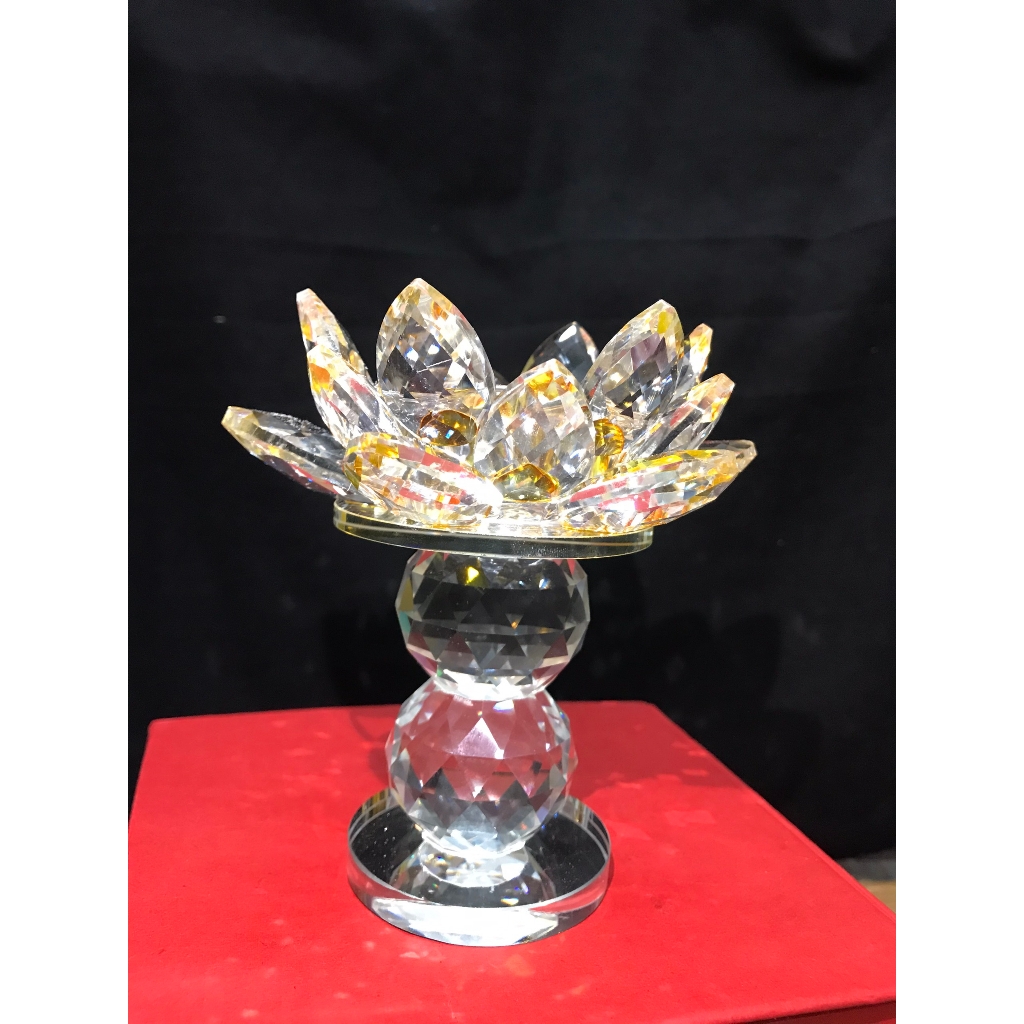 Chân Nến Hoa Sen Lưu Ly được chế tác tinh xảo từ chất liệu lưu ly cao cấp, trong suốt và lấp lánh như pha lê, mang lại vẻ đẹp sang trọng, thanh tịnh cho không gian thờ cúng. Hình tượng hoa sen biểu trưng cho sự thanh khiết, giác ngộ và bình an, rất phù hợp để đặt trên bàn thờ Phật, bàn thờ gia tiên hoặc trong các nghi lễ tâm linh.