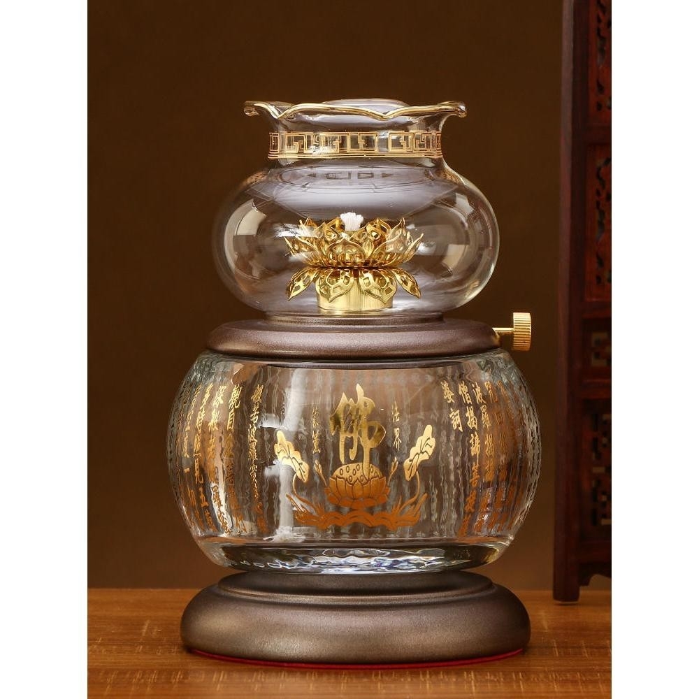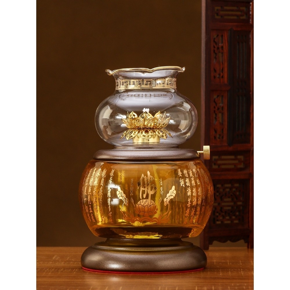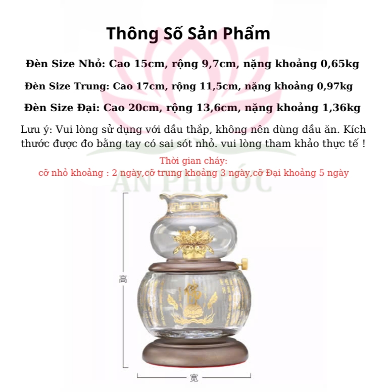 Đèn có thiết kế chắc chắn, chân đế vững, ly dầu trong suốt dễ quan sát lượng dầu, đảm bảo an toàn khi sử dụng. Pha lê trong suốt kết hợp họa tiết tinh tế giúp đèn không chỉ là vật phẩm thờ cúng mà còn là món đồ trang trí đầy tính thẩm mỹ.