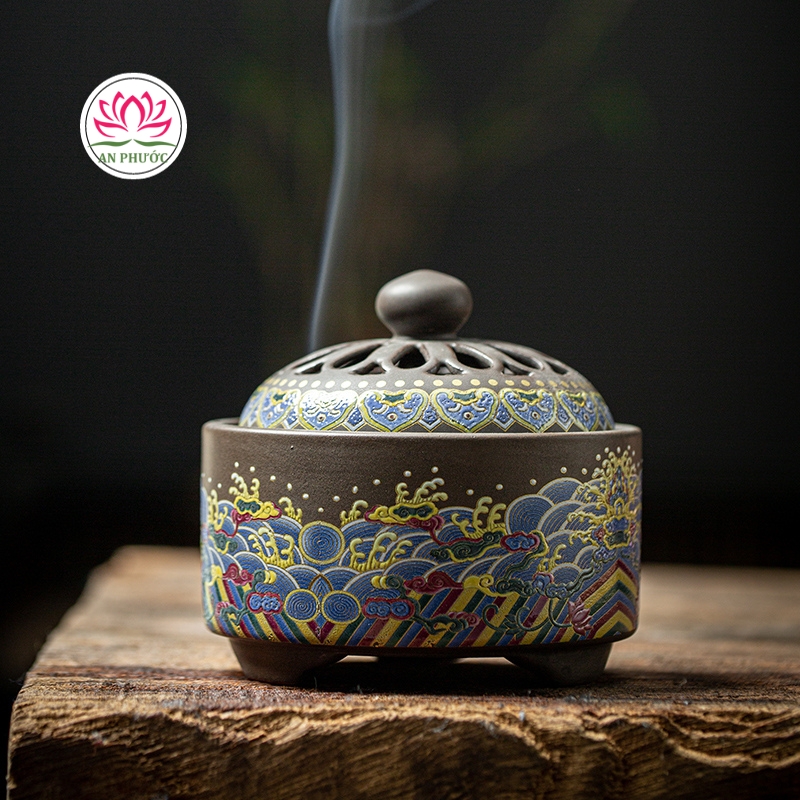 Lư xông trầm hương gốm sứ cao cấp được chế tác tinh xảo với hoa văn rồng, sen và chú mang ý nghĩa phong thủy sâu sắc. Chất liệu gốm sứ bền đẹp, chịu nhiệt tốt, giúp đốt trầm hương, nhang nụ, nhang vòng một cách an toàn và tỏa hương tinh khiết.