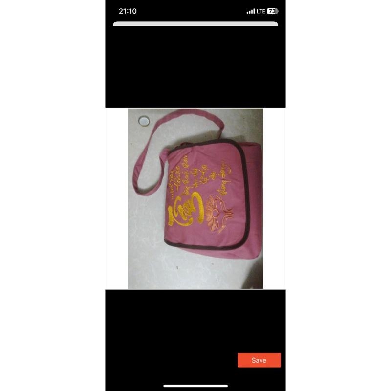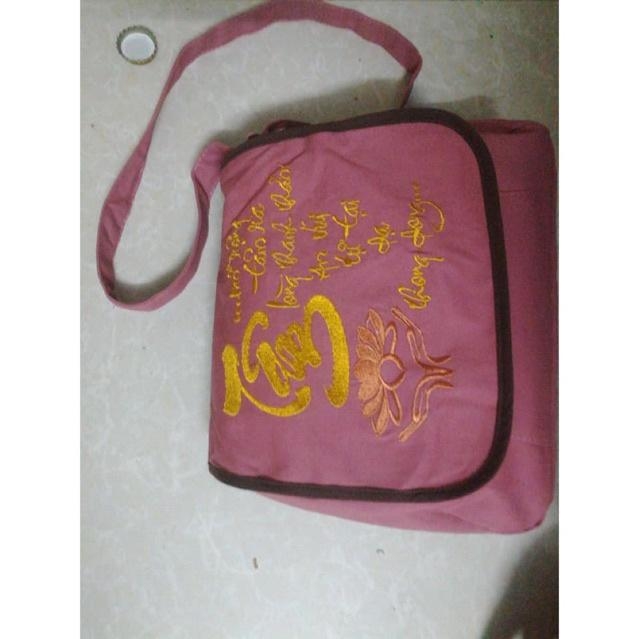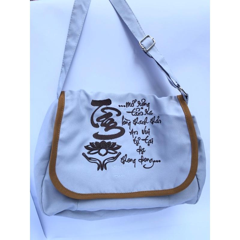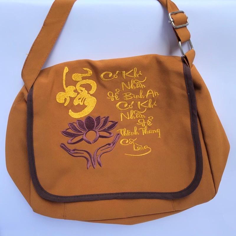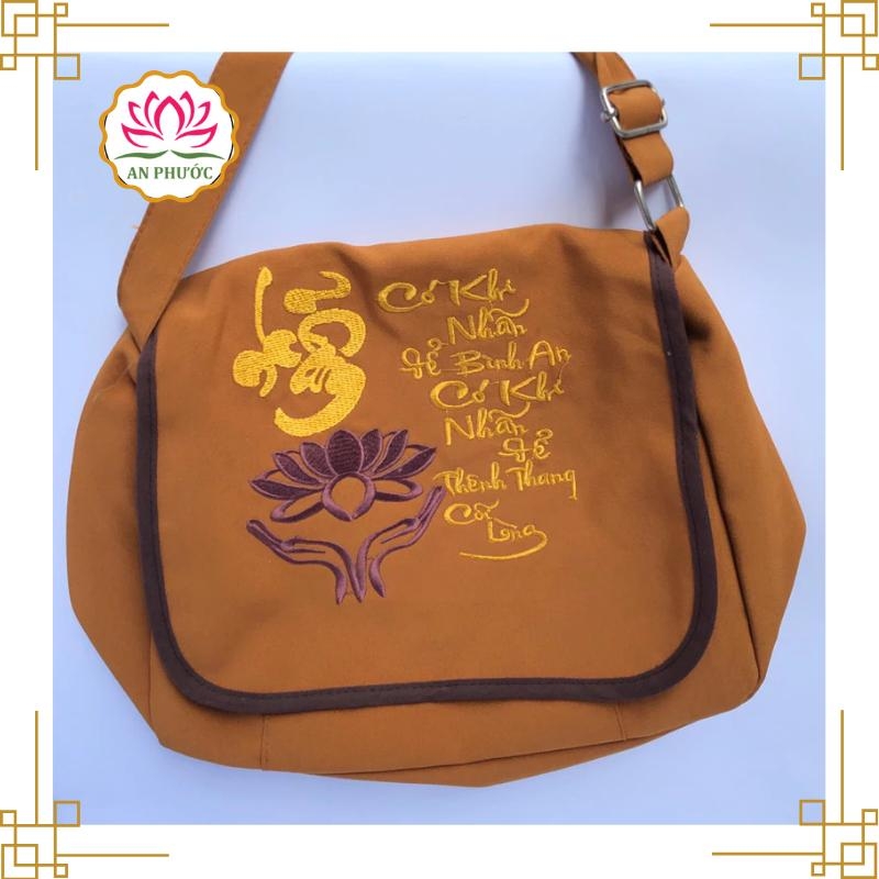 Sản phẩm thường làm từ vải bố, vải canvas hoặc vải thô, bền nhẹ, dễ giặt, thân thiện với môi trường. Kiểu dáng gọn gàng, có quai xách chắc chắn, thích hợp để đựng kinh sách, chuỗi hạt, khăn choàng, chai nước hay các vật dụng cá nhân khi đi chùa.